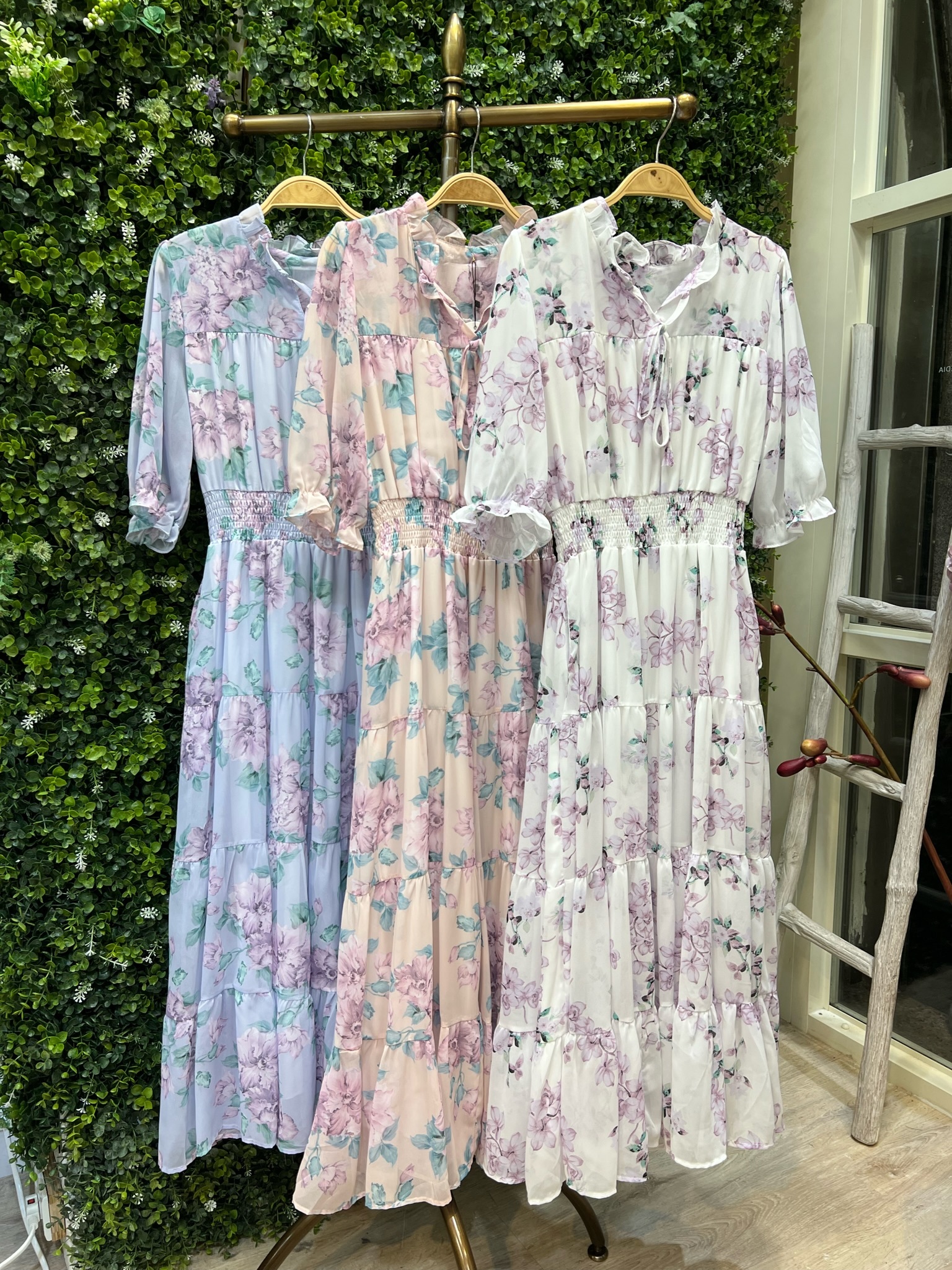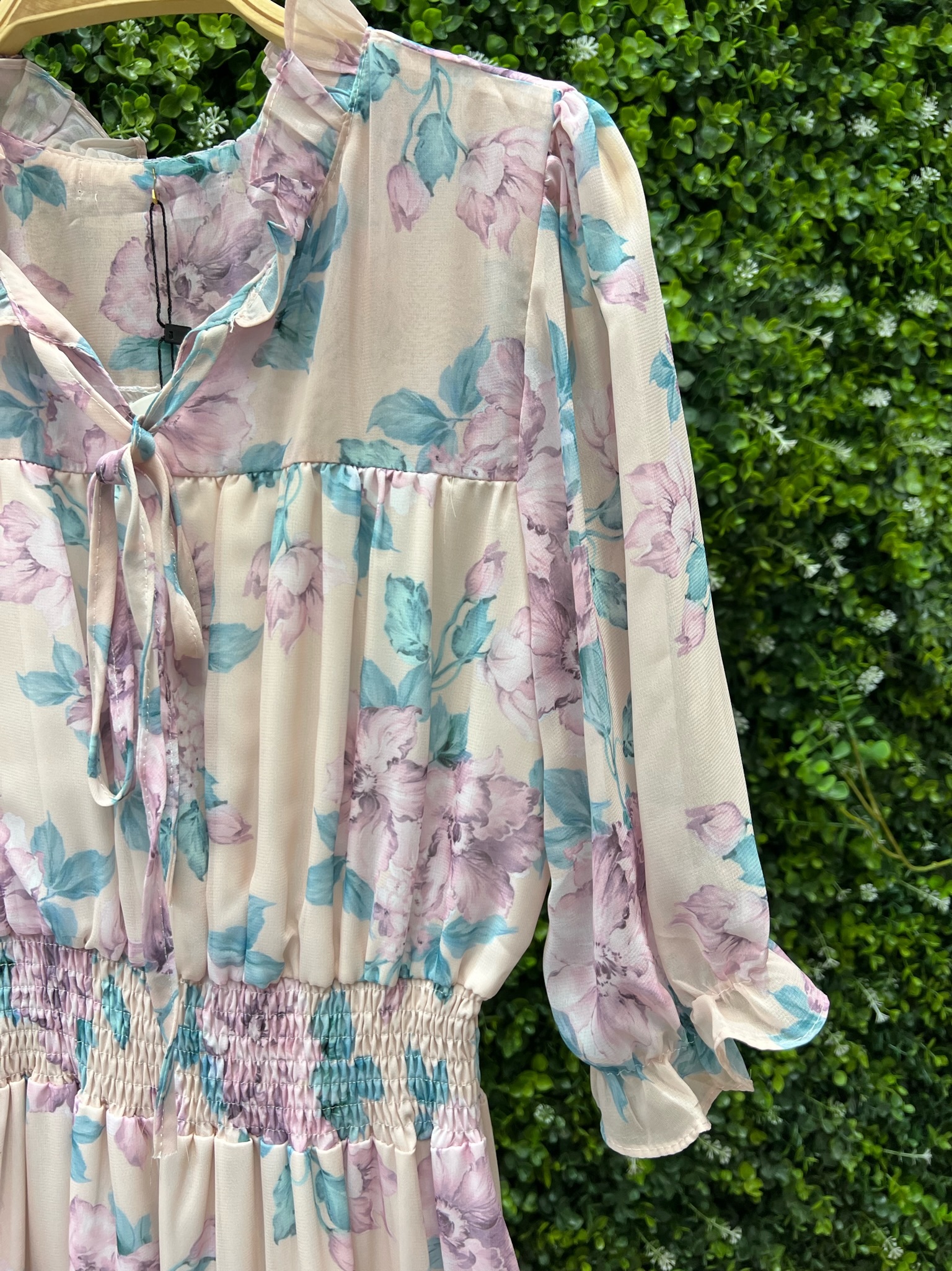 < 波浪領雪紡花朵長洋裝 >