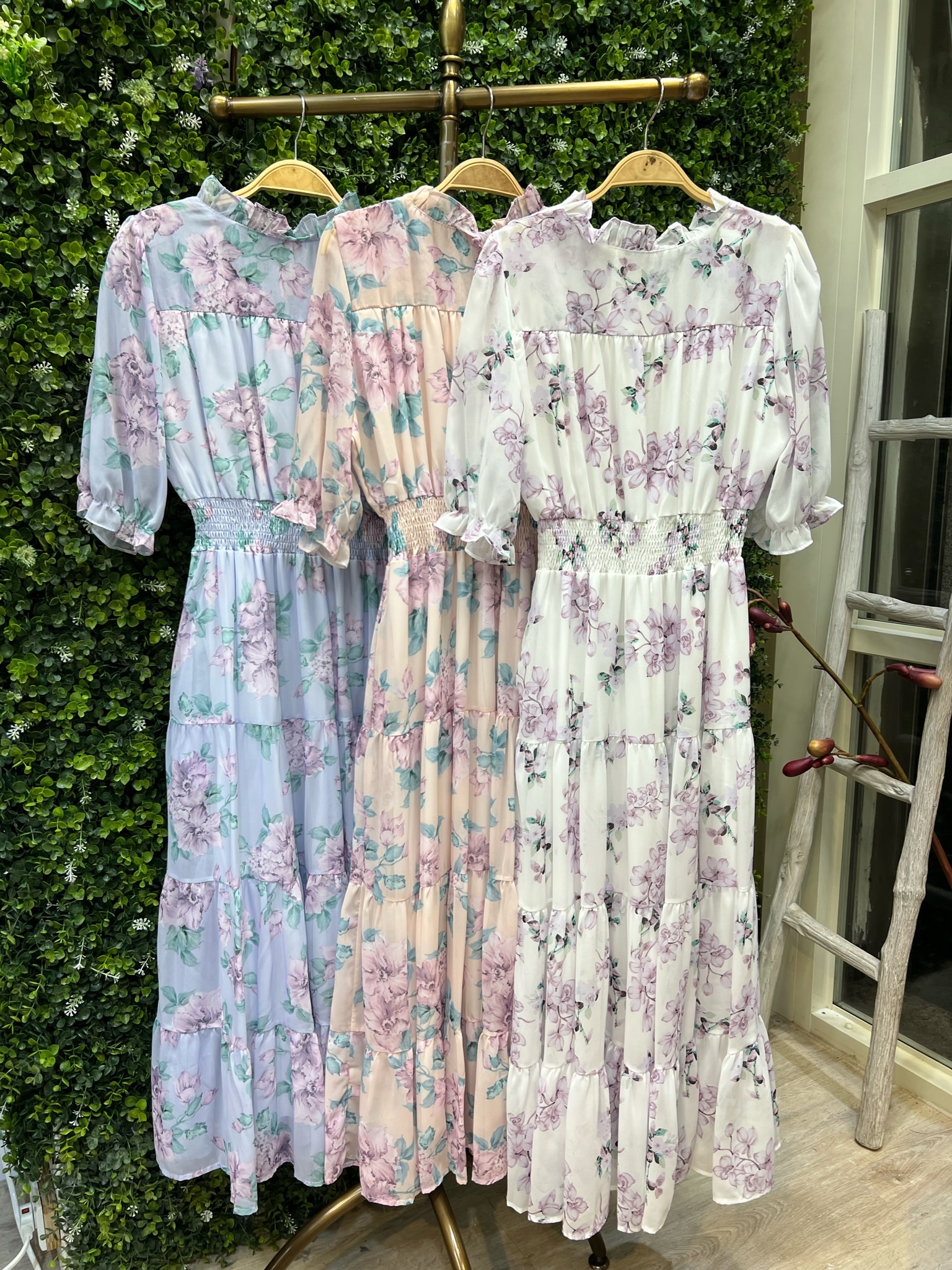 波浪領雪紡花朵長洋裝 / 花朵A