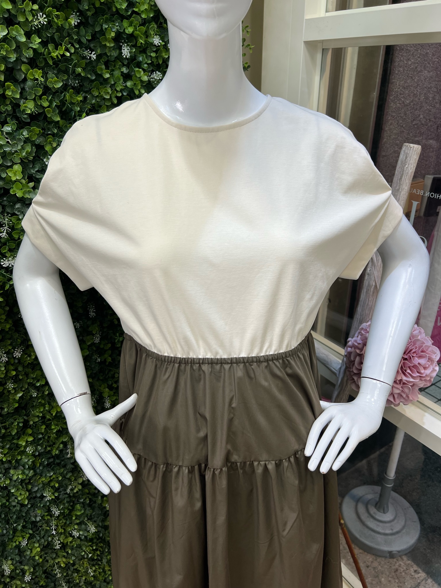 運用異素材拼接及腰間的設計,讓簡單的洋裝呈現有設計的質感!